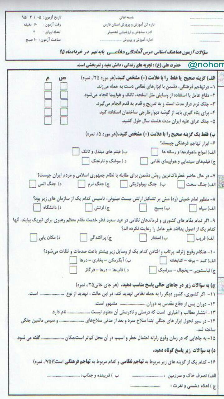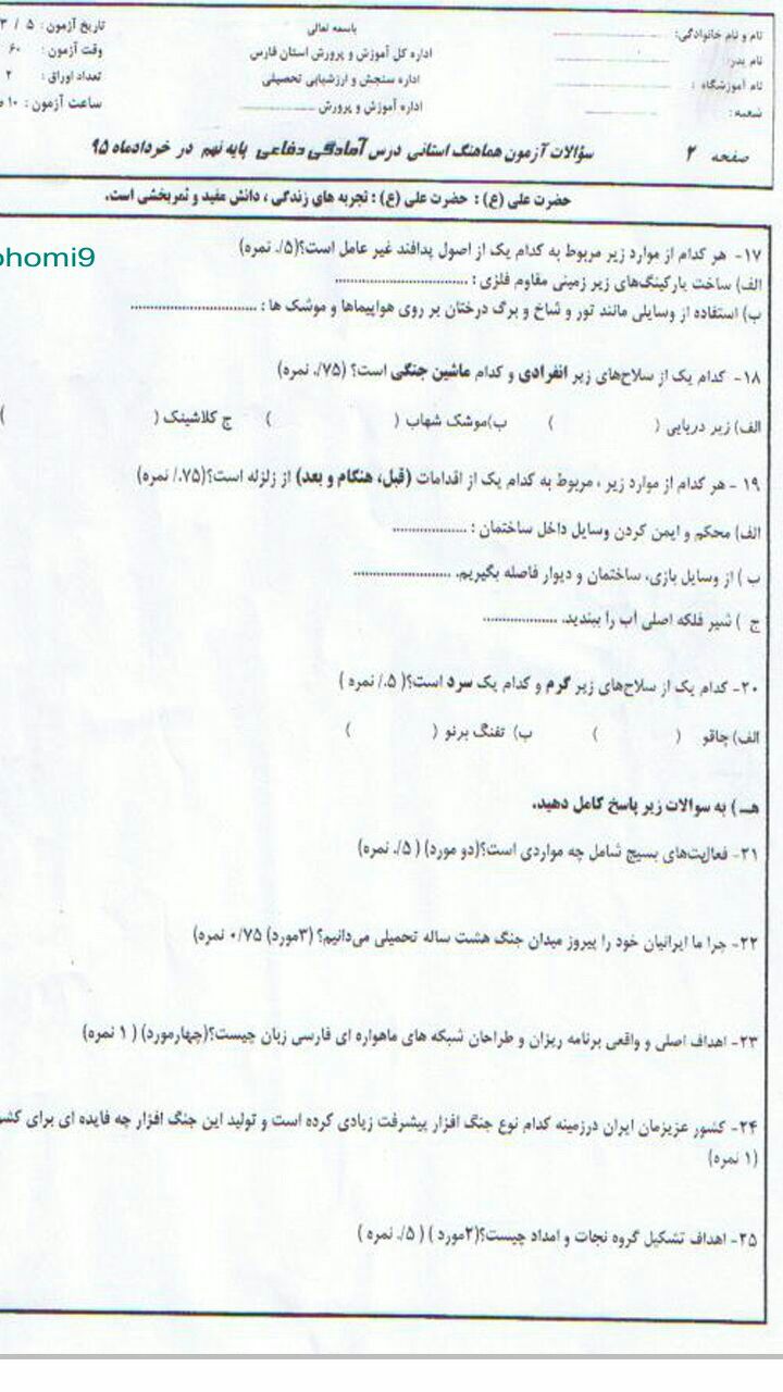 نمونه سوالات نوبت دوم دفاعی پایه نهم خرداد95